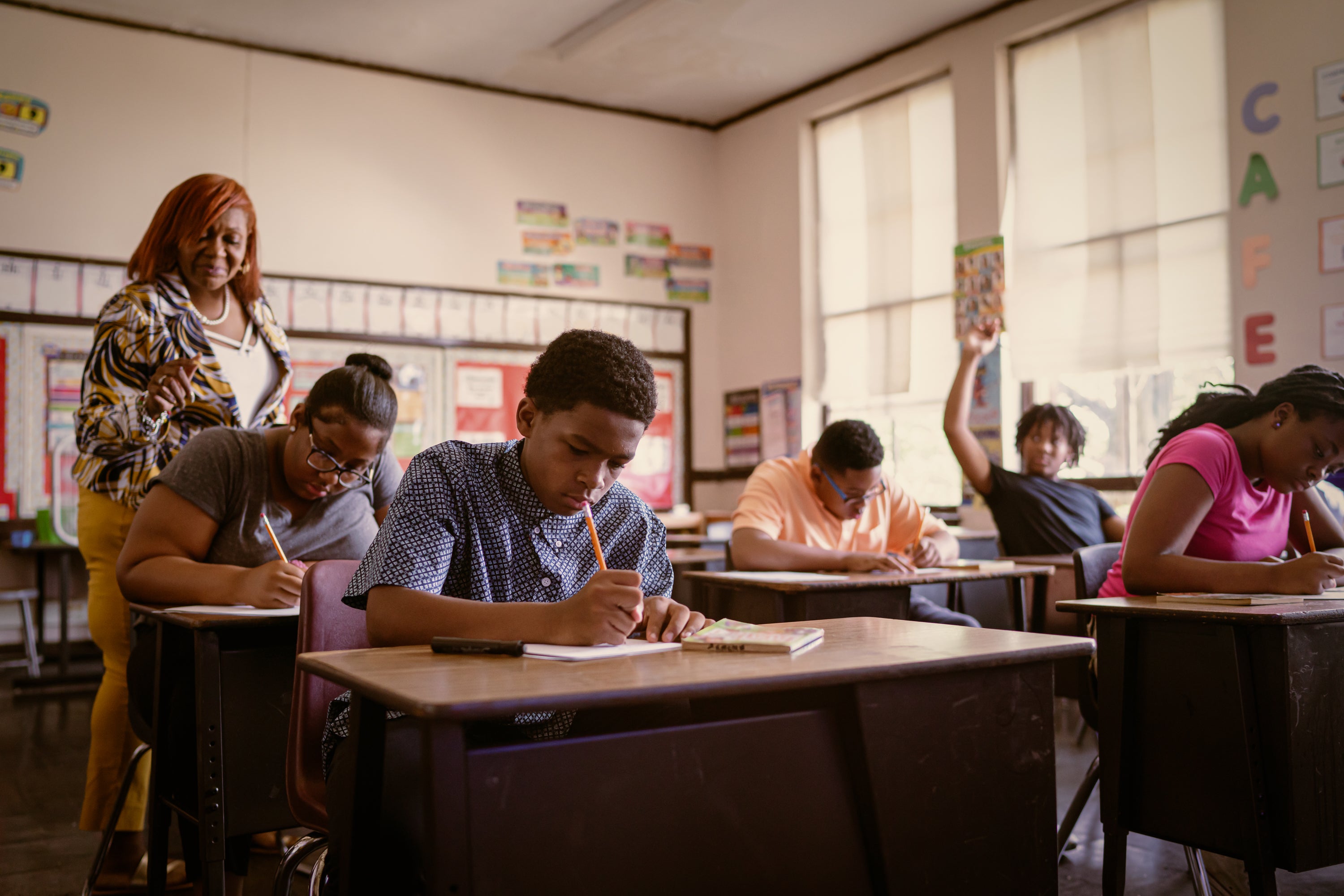 A teachers walks among students doing work at their desks.